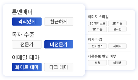 복잡한 지시어 없이 옵션만 선택하면 톤앤매너, 독자 수준, 스타일에 맞는 콘텐츠를 생성합니다. 전문가가 직접 작성한 것처럼 자연스럽고 일관된 콘텐츠를 누구나 손쉽게 제작할 수 있습니다.